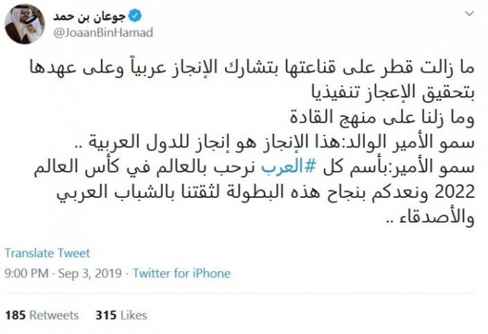 وختم سعادته التغريدة بما قاله حضرة صاحب السمو الشيخ تميم بن حمد آل ثاني أمير البلاد المفدى، حول استضافة قطر المونديال حين قال: "بأسم كل العرب نرحب بالعالم في كأس العالم 2022 ونعدكم بنجاح هذه البطولة لثقتنا بالشباب العربي والأصدقاء".